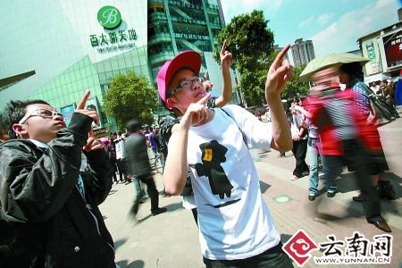 昨天(4月12日)下午1點40分左右,這些年輕人就開始在昆明南屏步行街廣場前聚集,大家三三兩兩地在一起說說笑笑。2點10分左右,突然傳來了一聲哨響,剛剛還在走來走去的人群突然不動了。動作甚至表情都僵硬不變。這一突發狀況也嚇壞了很多路過的市民,王女士表示:“當我發現周圍的人都突然不動了的時候,我一下覺得很恐怖,想這是什么陰謀?!”一些老人也非常不理解:“這些年輕人怕是都約好的了,全部在這里擺造型,一個二個表情還多嚴肅,我還以為是出了多大的事,被嚇著了。”
