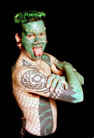 埃里克·斯普拉格,人稱“蜥蜴人”,生于1972年,是“分割舌頭”整容術的創始人,這種手術曾一度成為流行趨勢。為了讓自己看起來更像爬行動物,這名37歲的男子已經在紋身沙龍里度過了700小時。除此之外,他還在眉毛上方植入了10個特氟龍材料的“角”,并讓牙齒變得更加鋒利……