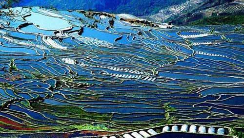 海拔2500米的云南哀牢山區元陽梯田平地極少,到處是濃綠的原始森林的哀牢山區,世代居住著哈尼族為主的山地居民。2500年前,哈尼族的祖先從西藏高原來到云南南部這個邊陲山區,初來乍到就遇到了一大難題:周圍的山谷根本不適宜種植。哈尼族人以頑強的民族性格與大自然搏斗,用石塊砌起圍墻,圍住新開墾的農田,還引來山泉灌溉,并在水霧繚繞的梯田中種植稻谷。