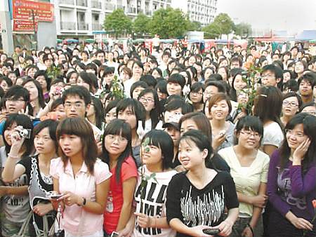 昨天下午,這個(gè)特殊的慶生派對(duì)在寧波一所高校北區(qū)宿舍商業(yè)區(qū)的中心廣場(chǎng)上舉行。下午4點(diǎn),光鮮的舞臺(tái)早已搭好,舞臺(tái)上拉著巨幅的噴繪背景,還有樂(lè)隊(duì)演奏著歡快的樂(lè)曲。