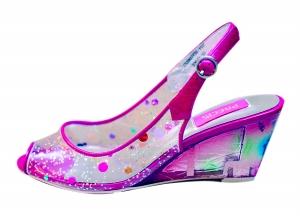 桃紅色透明坡跟鞋(PRECIS,739元)魚口的造型、透明中帶有五顏六色彩紋的鞋身和鞋跟就像一個精致的玩具,能提高倔強金牛女的親和力。