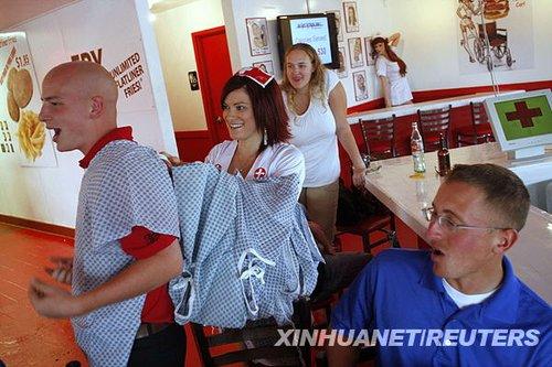 6月17日,在美國亞利桑那州錢德勒的“心臟病燒烤”餐廳,女服務員在食客就餐前為其穿上病人服。新華社/路透