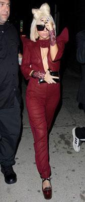 Lady Gaga品位獨(dú)特,著裝常成為議論焦點(diǎn)。近日上街時(shí),她穿著了一件暗紅色半透明的連體衣,復(fù)古墊肩設(shè)計(jì)是潮流指標(biāo),性感的深V領(lǐng)則為Gaga的一貫作風(fēng)。她能將一本正經(jīng)的連體衣穿出自己的風(fēng)格,想突出風(fēng)格就得敢穿敢為。
