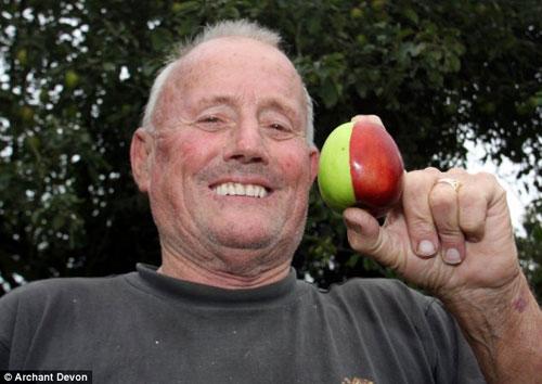 家住英國(guó)德文郡的肯·莫里斯近日無(wú)意中發(fā)現(xiàn),家中花園的蘋果樹(shù)上結(jié)了一個(gè)奇怪的蘋果:半紅半綠,而且從中間完美地區(qū)分開(kāi)。老人猜想,大概有人搞了惡作劇,把他的蘋果涂成了這種顏色。