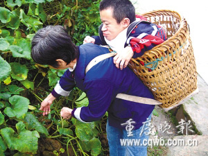 昨日上午,天空飄著細(xì)雨。巴南區(qū)南彭鎮(zhèn)鴛鴦村一條泥濘的鄉(xiāng)間小路上,一位身穿藍(lán)色外套、腳穿解放鞋,身體瘦弱的老婦人,背著一個小背篼,背篼里裝著一個面相30多歲、身高只有幾十厘米的男子,緩慢地走在路上。