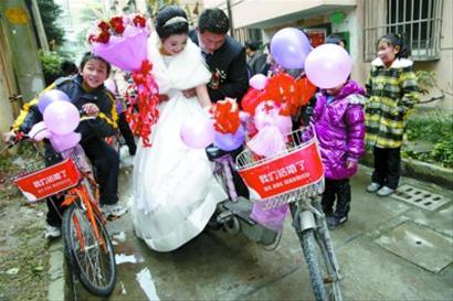 “四輪車人人結婚都會乘,兩個輪子的就少見了吧。 ”新郎孫軍說,現(xiàn)在政府提倡節(jié)能以保護環(huán)境,用租賃自行車迎親,既響應了政府號召,又降低了婚禮成本。并且這種形式與眾不同,非常有紀念意義。新郎新娘都姓孫,在同一家房地產公司工作,在商量婚事時,新娘希望能用一種別樣的方式來紀念他們的特殊緣分,于是這個自行車迎親方案立即得到了大家的青睞,“很特別,能讓人記一輩子”,新娘笑著說。