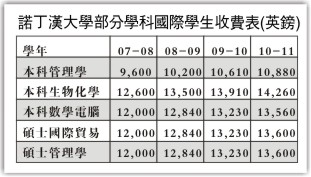 諾丁漢大學(xué)位于英國(guó)中部。由于近幾年與中國(guó)多所院校合作辦學(xué),中國(guó)留學(xué)生成批涌進(jìn)這所大學(xué);同時(shí)該校還在浙江寧波設(shè)立分校,有條件的大三學(xué)生會(huì)到英國(guó)讀書一年。記者聯(lián)系到該校的碩士研究生陳兵同學(xué),他詳細(xì)列出該校歷年來的收費(fèi)標(biāo)準(zhǔn)。今年的學(xué)費(fèi)比去年略有上漲,但增長(zhǎng)率與往年持平。他覺得這個(gè)上調(diào)的價(jià)格是合理的,中國(guó)來的同學(xué)都能接受。