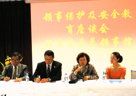 中新網11月30日電 據新西蘭中華新聞通訊社消息,25日下午,中國駐奧克蘭總領館在簽證大廳舉辦了一場華人及留學生領事保護安全座談會。廖菊華總領事主持會議,工黨華人國會議員霍建強、國家黨黃徐毓芳部長助理鄭楠,以及特別邀請的三位華裔新西蘭警官出席了座談會,他們先后就如何強化華人在新西蘭的法律及自我保護意識進行講座。