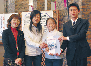中新網(wǎng)3月5日電 據(jù)《日本新華僑報》報道,3月3日,日本和歌山縣“和歌山西輪轉(zhuǎn)俱樂部”在Laffina禮堂為即將畢業(yè)的留學(xué)生舉行了“畢業(yè)紀(jì)念相冊”贈送儀式。“和歌山西輪轉(zhuǎn)俱樂部”的國際服務(wù)委員會的主井知子委員長親手將“紀(jì)念相冊”交給了中國留學(xué)生鄭秋杰(26歲),金香梅(24歲)和代向斐(23歲)。據(jù)悉,該紀(jì)念相冊是和歌山縣專門為和歌山大學(xué)的留學(xué)生們制作的。