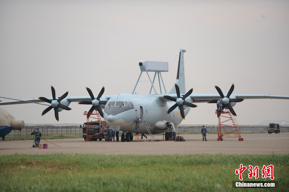 空警-200機載雷達天線類似體操用的平衡木,是中國自行研制的一種輕型、全天候空中型預警飛機,在運8C型機基礎上進行了80%以上改動而成。曾在2009年國慶閱兵中現身。(完)