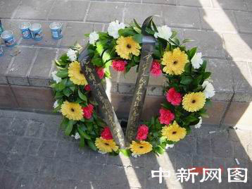 圖:中國使館官員在特拉維夫爆炸現場獻花圈