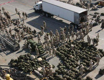 一支美海軍陸戰隊遠征部隊正準備從加利福尼亞圣地亞哥海軍港口,乘坐“好人理查”號兩棲攻擊艦前往波斯灣。與此同時,還將有六艘兩棲艦負責運送其它作戰單位一同前往。