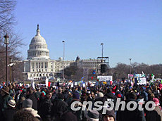 數萬美國人十八日中午聚集華盛頓的國會山前,舉行聲勢浩大的反戰示威游行,反對對伊拉克動武。作者:余東暉
