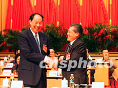 海南省政協二十日選舉王廣憲為政協新主席(左),老主席陳玉益(右)向他表示祝賀。作者:關向東