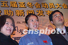 中國(guó)代表團(tuán)出征第五屆亞冬會(huì)動(dòng)員大會(huì)二十七日在北京舉行,冬奧會(huì)冠軍楊揚(yáng)成了新聞媒體及與會(huì)人員追逐的熱點(diǎn)。圖為與會(huì)人員爭(zhēng)相與楊揚(yáng)合影留念。作者:武仲林