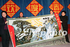 國務(wù)院僑辦主任陳玉杰(右一)與副主任李海峰(左一),二十七日在僑辦新春聯(lián)歡會上,代表國務(wù)院僑辦機關(guān)接受機關(guān)定點扶貧地區(qū)甘肅積石山縣代表贈送的新年壁毯禮品。作者:鄒憲