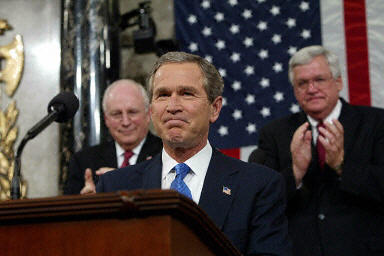 在當地時間周二晚間發表的國情咨文中,布什表示:“有人說在危機來臨的時候,我們再作出反擊。難道等恐怖主義分子和暴君表明了他們的意圖后,我們再關注他們的進攻嗎?如果威脅突然出現,那么所有的行動,所有的話,所有的自責,都已為時已晚。”他表示,“相信薩達姆心智健全,認為他會容忍克制的想法是不合適的。”