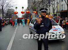 法國六十多個華人社團歡天喜地慶新春,聯合組織的彩妝巡游在巴黎十三區舉行。法國警方為華人新春彩妝巡游開道。作者:蔚中