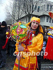 法國華人社團新春聯(lián)合組織的盛大彩妝巡游在巴黎十三區(qū)舉行,法國人和華人一道歡天喜地慶新春。圖為舞龍隊的女指揮。作者:蔚中