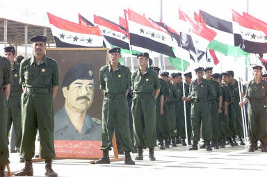 在一個(gè)插滿稱(chēng)贊薩達(dá)姆的旗幟的體育場(chǎng)上,許多貴賓和學(xué)生在觀看數(shù)萬(wàn)名軍人照著軍樂(lè)隊(duì)的節(jié)拍列隊(duì)行進(jìn),時(shí)間達(dá)兩個(gè)多小時(shí)。這些士兵一面行進(jìn),一面揮舞各式武器,其中包括步槍和火箭筒。