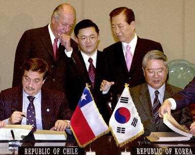韓國和智利政府15日在漢城簽署了自由貿易協定,為擴大兩國間的貿易創造條件。這是韓國與外國簽署的第一個自由貿易協定。