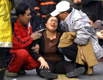 韓國警方表示,韓國當地時間18日上午9:55韓東南部城市大丘發生地鐵縱火事件,造成百余人傷亡。圖為遇難者家屬痛哭欲絕。