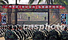 中國第一部全方位表現(xiàn)解放軍參加國際偵察兵軍事技能大比武的電視連續(xù)劇《世紀突擊》,二月二十二日在海南五指山某軍事基地開拍。圖為壯觀的開拍儀式。作者:古月