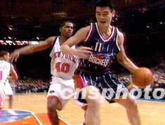 圖為姚明晃過對方防守隊員準備上籃。作者:中新社