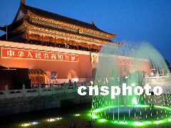 北京市政府有關部門26日透露,為了迎接全國“兩會”召開,從2003年3月2日至3月19日,北京全市范圍內按重大節日要求開放夜景照明設施,開燈時間為每天18時30分至23時。圖為天安門夜景。郎從柳 攝