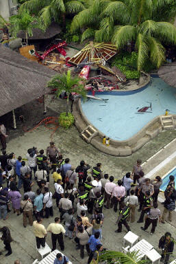 酒店保安監督穆哈迪相信﹐該直升機在21樓停機坪著陸時﹐突遇一陣強風﹐被吹落樓頂。直升機墜落在兒童泳池旁邊及三樓平臺一家露天酒吧﹐部分殘骸散落池中。直升機支離破碎,但未起火。