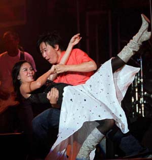 李心潔當晚和好友阿牛的“親密”演出掀起全場高潮,為了阿牛,李心潔又是伴舞又是陪唱,更破例在臺上演唱廣東歌《失戀好煩》,雖然只是和音,但她和阿牛的“阿哥哥”舞就叫大家忍不住HIGH起來,最后心潔更把右腳踩在阿牛的左大腿上,讓阿牛驚呼∶“李心潔,終于踩對地方了!大家知不知道她彩排時常踩錯地方!”臺下一陣爆笑!