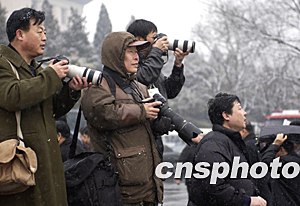 全國人大代表在六日參加十屆全國人大一次會議時正逢北京雨雪飄飛,在人民大會堂東門等候代表的記者全副武裝。作者:廖文靜