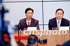 香港入境事務(wù)處處長黎棟國(右)與財經(jīng)事務(wù)及庫務(wù)局首席助理秘書長劉應(yīng)彬,3月11日在記者會上,就資本投資者入境計劃及輸入內(nèi)地人才計劃答記者問。洪少葵 攝