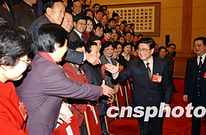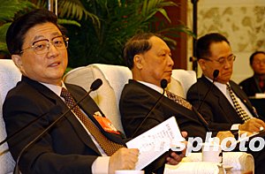 今天是十屆全國人大第一次會(huì)議河北團(tuán)全體會(huì)議,中共中央政治局常委黃菊與代表們共同審議。