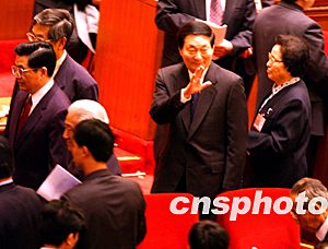 朱鎔基總理三月十四日在北京人民大會堂出席十屆全國政協(xié)一次會議閉幕式,最后離場時(shí)俯身抱拳向委員們祝福。