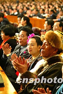 十屆全國人大一次會(huì)議十七日舉行第七次全體會(huì)議,表決全國人大各專門委員會(huì)組成人員,決定國務(wù)院副總理、國務(wù)委員、各部部長、各委員會(huì)主任、中國人民銀行行長、審計(jì)長、秘書長人選。圖為代表鼓掌祝賀新一屆政府組成。作者:毛建軍