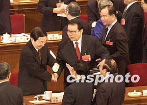 朱镕基三月十八日參加十屆全國人大一次會議閉幕會后,與李長春等代表握手致意。作者:盛佳鵬