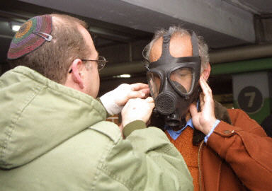 2003年3月18日在耶路撒冷分配中心,以色列軍隊(duì)的士兵指導(dǎo)以色列人使用防毒面具,軍隊(duì)今天命令以色列人準(zhǔn)備封閉的房間來(lái)避免伊拉克可能使用的化學(xué)攻擊帶來(lái)的危害。