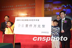 湖南沐林現代食品有限公司董事會主席伍躍時30日在北京人民大會堂通過中國光彩事業促進會、中國少年先鋒隊全國工作委員會等單位,向中小學生捐贈價值1000萬元人民幣的沐林谷物營養早餐,拉開“健康從早做起,健康奔小康”活動序幕。作者:趙振清