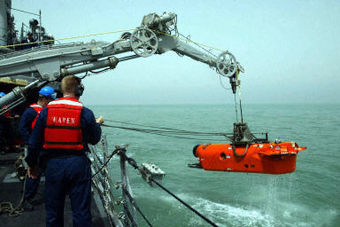 30日,美軍艦“掠奪”號使用水雷壓制裝置在伊拉克南部烏姆蓋斯爾水域執行掃雷任務。