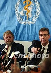 世界衛生組織駐中國代表處三月二十四日邀請外國專家在北京向中外記者介紹全球非典型肺炎情況。圖為世界衛生組織駐中國代表Benk Bekedam(右)和澳大利亞微生物學家John S.MacKenzie博士(左)在新聞發布會上。作者:張煒