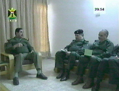 就在美英聯軍逼近巴格達之際,伊拉克電視臺3日晚播放了薩達姆主持一個會議的畫面。薩達姆身穿軍裝,顯得平靜而有條不紊。