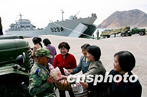 駐守在中國渤海深處一座小島上的數百名民眾,得知與他們朝夕相處的解放軍某導彈部隊官兵要外出執行春季任務時,紛紛送來海產品等到碼頭為官兵送行。作者:崔文斌