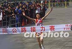 中新社北京四月十三日電(記者沈晨)參加過數(shù)次北京國際公路接力賽的邢慧娜今天第一次嘗到了沖刺后勝利的喜悅。