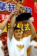 廣東宏遠隊4號隊員杜鋒在八一雙鹿隊隊員防守下上籃