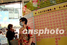 香港一購物商場特設顧客心意咭,感謝為對抗非典型肺炎的醫護人員。據醫管局26日公布,首次有醫護人員在照顧SARS病人時受到感染而殉職。洪少葵 攝