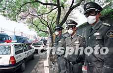 圖:北京保安在重點隔離區維護秩序 (2003-04-27 17:38:23)