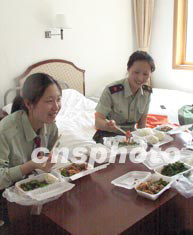 圖為沈陽軍區的醫護人員四月二十九日在北京小湯山住地午餐。作者:王麗南