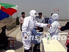 中國交通部五月再令各地迅速采取措施,嚴防“非典”向農村擴散。圖為交通部門在路口設立衛生檢查站,對車輛人員進行檢查消毒。作者:中新社