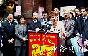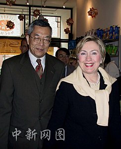 紐約州聯(lián)邦參議員希拉里·克林頓五日到訪紐約華埠,支持華埠抗擊“非典”謠言的行動。左為亞美商業(yè)發(fā)展中心總裁王章華。中新社記者 趙海燕 攝